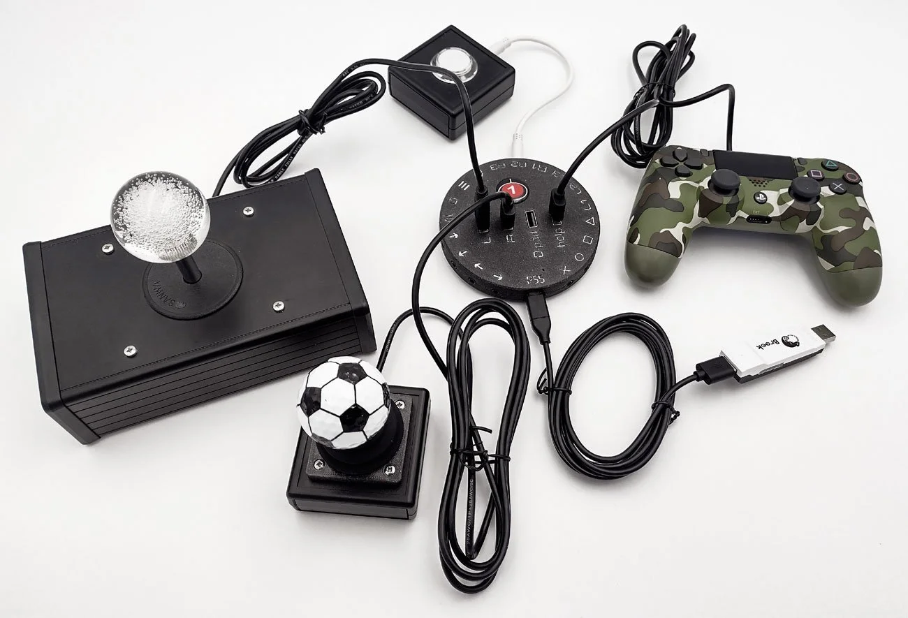 The Catch 22 interface can be purchased from OneSwitch. They have a separate page to order the Nintendo Switch/Switch 2, PlayStation 5, and Xbox compatible versions. The interface has similar compatibility to the Xbox Adaptive Controller for USB joysticks. Please note that the joysticks with the 3.5mm stereo jacks are not directly compatible with this controller. Any standard adaptive switch will work with the switch ports. For the “help” USB port, the Catch 22 interface will work with a PS4 Dualshock, PS5 Dualsense, HORI controllers, wired Switch Pro Controller, and some other generic controllers. See below for resources for getting compatible joysticks and switches compatible with the Catch 22 interface.